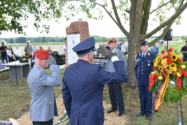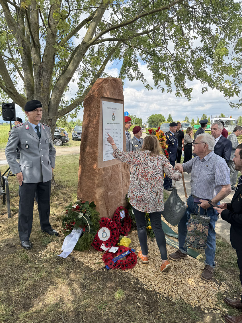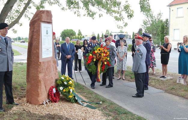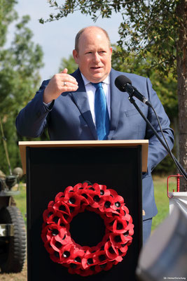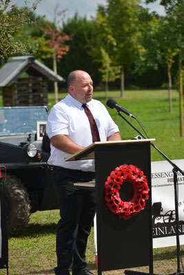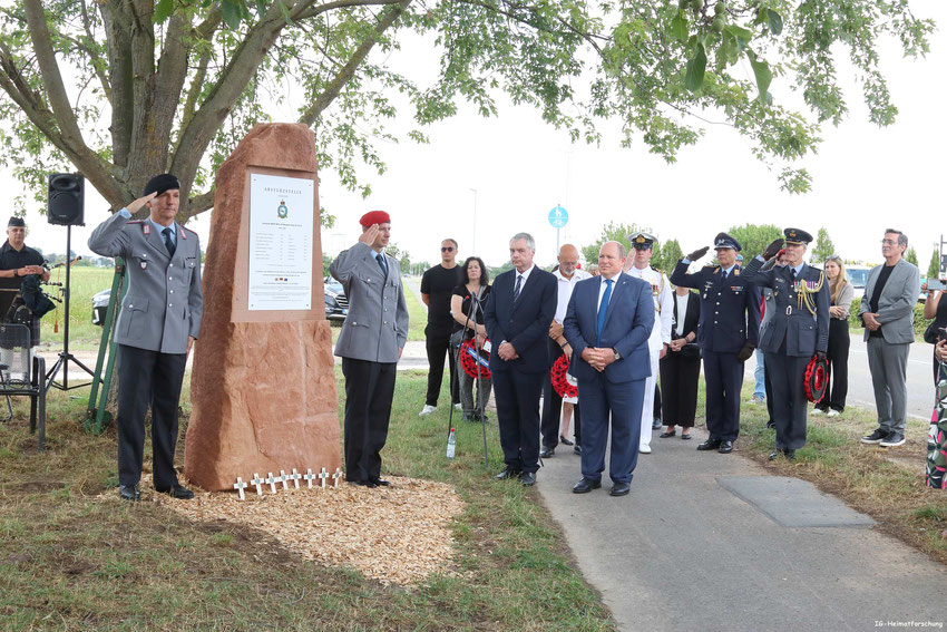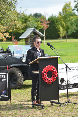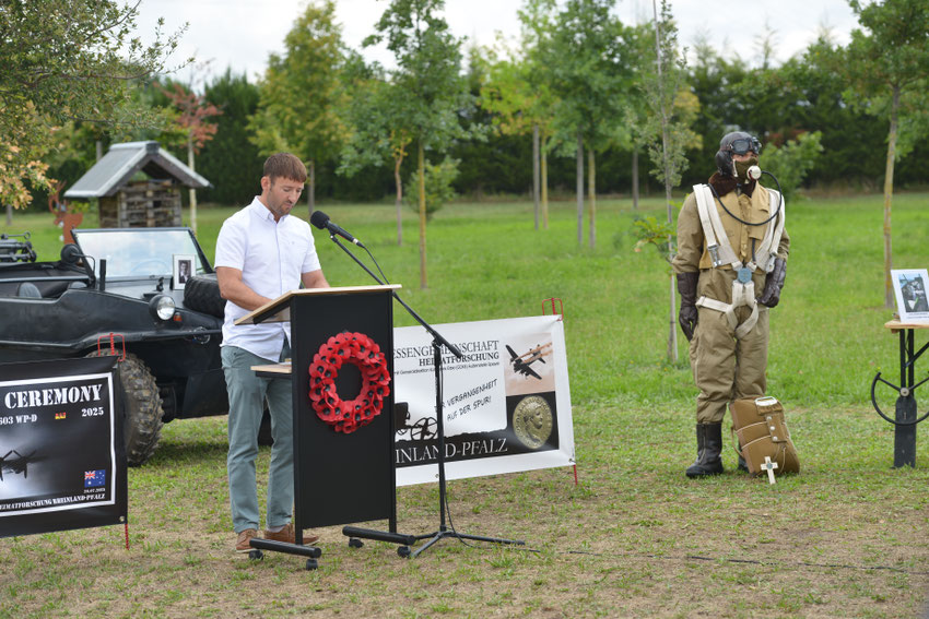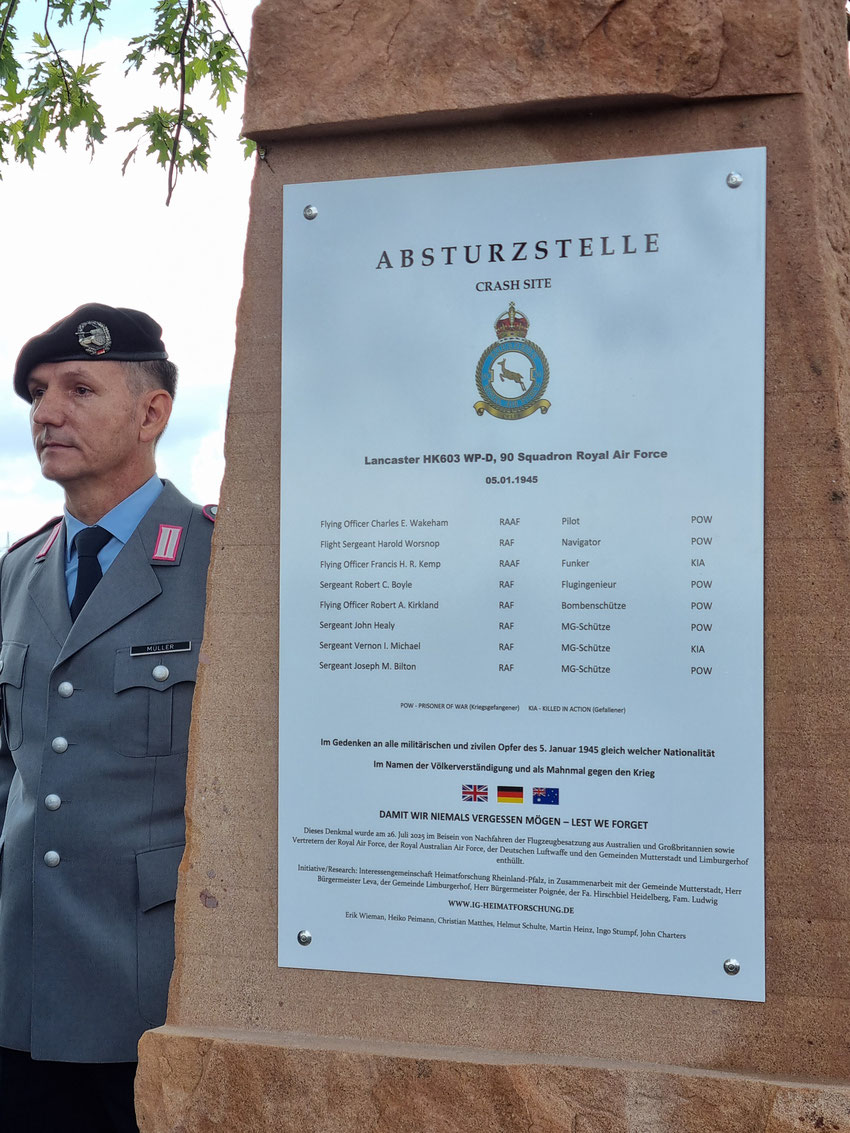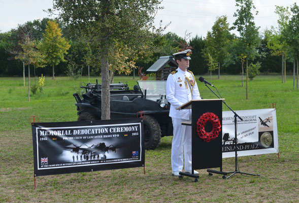 In Anschluss hielt Herr Bürgermeister Thorsten Leva von der Gemeinde Mutterstadt eine Rede, gefolgt von Group Captain Herr Mark Heffron, Militärattaché der britischen Botschaft in Berlin. Group Captain Heffron ist bereits seit 2019 bei Veranstaltungen der IG Heimatforschung zugegen, und wir haben uns bereits wieder für 2026 (geplante Gedenkfeier für eine weitere abgeschossene RAF-Besatzung) verabredet. Das australische Militär war verteten durch Lieutenant Commander Benjamin Pigott (Stellv. Militärattaché) von der australischen Marine. Er war ebenfalls aus Berlin angereist und hielt anschließend seine Rede. Das deutsche Militär wurde vertreten durch Herrn Oberst Michael Trautermann. Herr Oberst Trautermann, der wie Militärattaché Herr Mark Heffron auch schon mehrmals bei unseren jährlichen Gedenkfeiern zu Gast war, kam diesmal als Kommandeur des Landeskommandos Rheinland-Pfalz nach Mutterstadt/Limburgerhof. Die Jahre zuvor war er im Nato-Hauptquartier in Ramstein stationiert gewesen. Er hielt anschließend seine bewegende Rede.