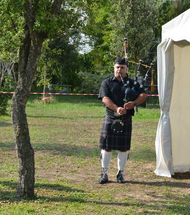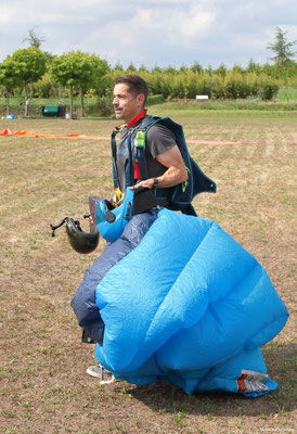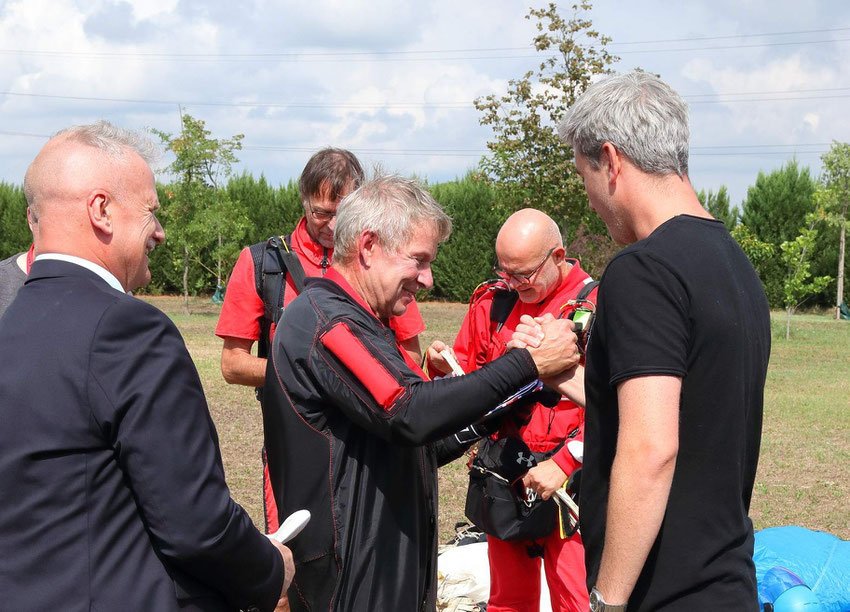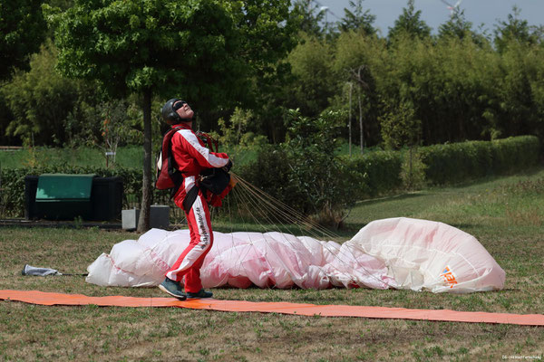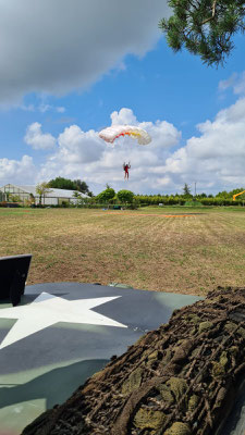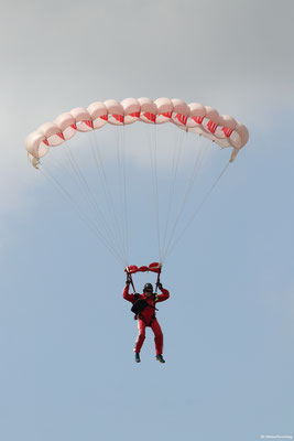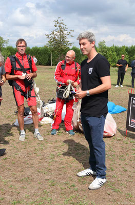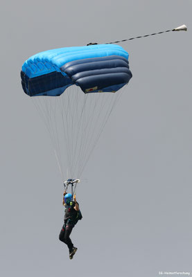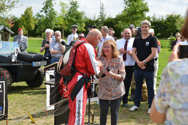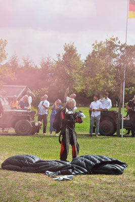 Die Gäste stellten sich nun am Rand des geplanten Landeplatzes auf, nachdem ein Support-Team des Flugplatzes Walldorf vorher die erforderlichen Bodenmarkierungen gesetzt hatte. Als das Flugzeug in Sicht kam, zündete die Bundeswehr mehrere rote Rauchtöpfe und schon bald waren alle vier Springer in der Luft über der Absturzstelle. Thomas Chelius spielte mehrere Lieder auf dem Dudelsack und unter Applaus der anwesenden Gäste machten die Fallschirmspringer einer nach dem anderen eine Punktlandung direkt vor uns auf dem Rasen. Ein Highlight für alle anwesenden Gäste.