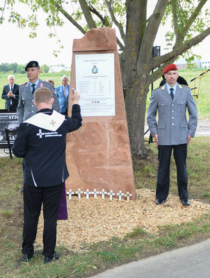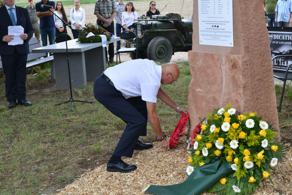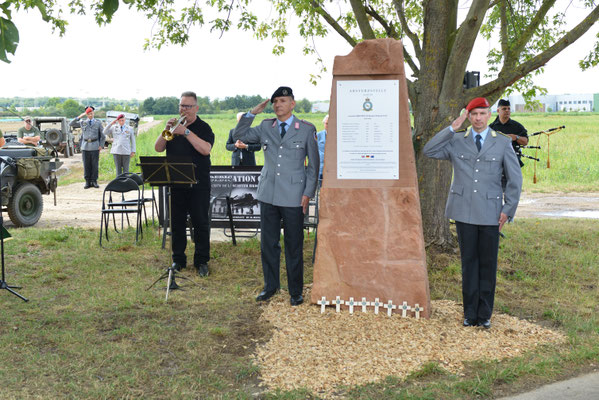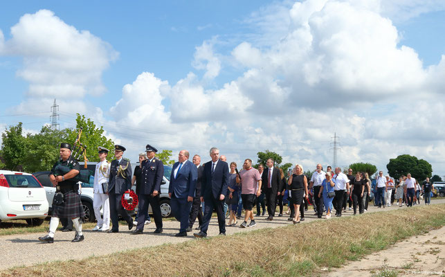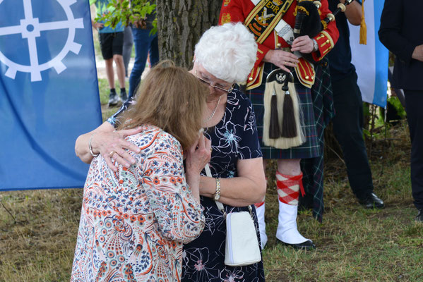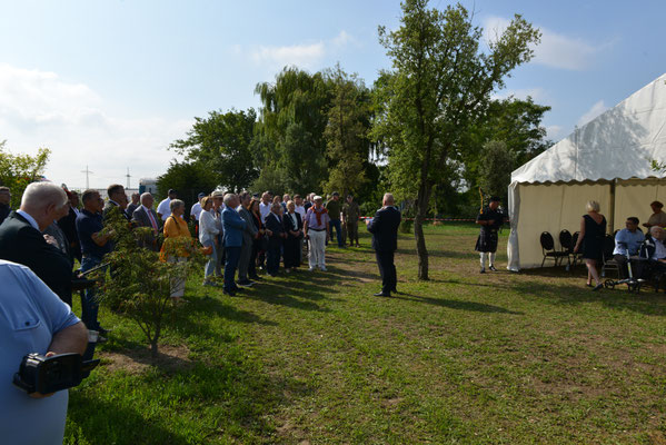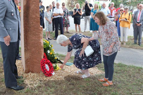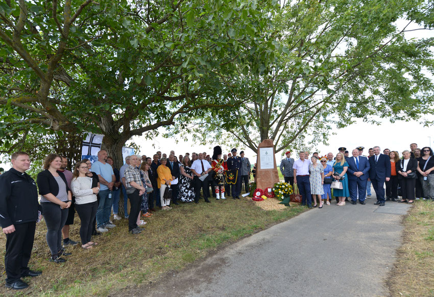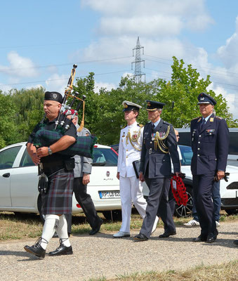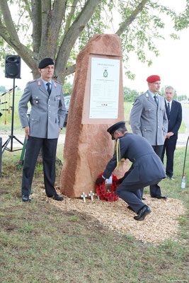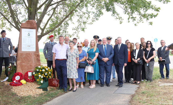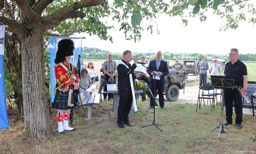 Danach bat ich die beiden Bürgermeister, Herrn Thorsten Leva und Herrn Andreas Poignée, den Stein zu enthüllen. Unter Applaus aller Gäste entfernten sie die Fahne. Militärdekan, Herr Alexander Prosche, weihte daraufhin den Stein und sprach ein Gebet. Nun war es Zeit für den traditionellen Last Post. Ich bat den Kornettisten, Herrn Markus Mohr, nach vorne und las zuerst alle 8 Namen der Besatzungsmitglieder laut vor. Herr Mohr spielte anschließend den Last Post. Eine Schweigeminute rundete diesen emotionalen Moment ab. Eine Zeit für Reflektion. Anschließend, nachdem Pipe Major Mackenzie mit seinem Dudelsack das nächste Lied angestimmt hatte, gab es Gelegenheit, Kränze und Blumen niederzulegen.