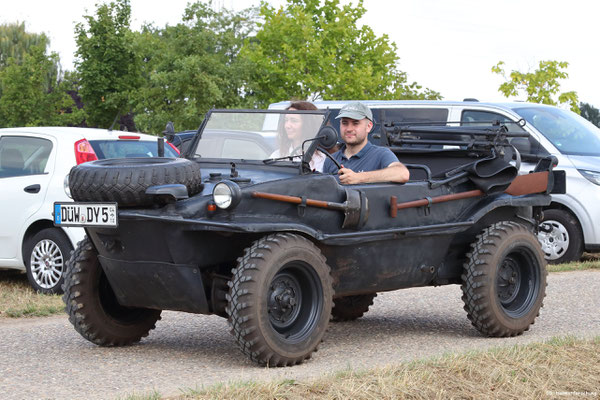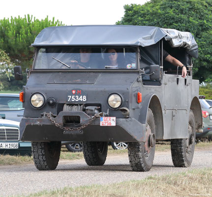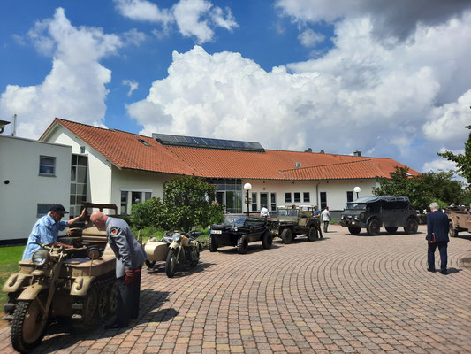 Inzwischen kamen auch Mitarbeiter und Mitarbeiterinnen des Bauhofes und der Gemeinde, die sich an der Absturzstelle im umzäunten Bereich um den letzten Schliff kümmerten. Der Sektempfang sowie die Lautsprecheranlage wurden aufgebaut, etc. Die Unterstützung seitens der beiden Gemeinden war wirklich hervorragend. Nach und nach trafen auch die Sammler/Besitzer der historischen Militärfahrzeuge ein, in denen wir später auch in das Restaurant fahren würden. Es war wieder eine historisch interessante Mischung aus Kettenkrad Sd.Kfz.2, verschiedenen Willys-Jeeps, einem Schwimmwagen, einem Horch 901 sowie einem Iltis, Saurer, einem Motorrad samt Seitenwagen anwesend, um den Gästen etwas fürs Auge bzw. die Möglichkeit zu bieten, in diesen Fahrzeugen mitzufahren. Dies würde, wie erwartet, auch diesmal wieder sehr gut ankommen.