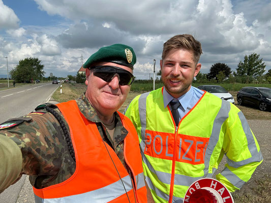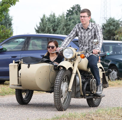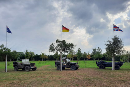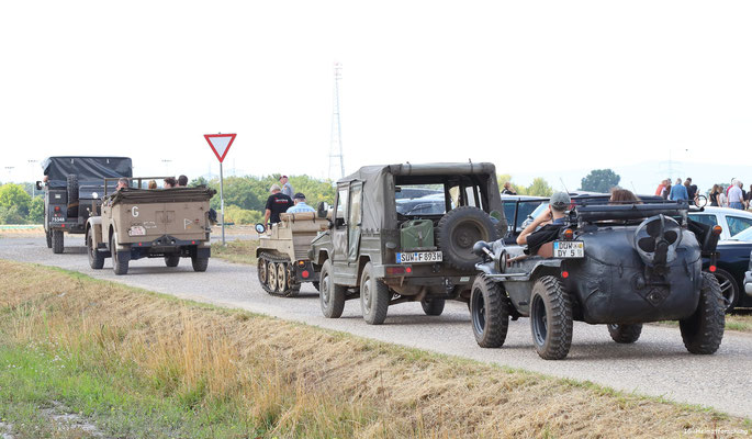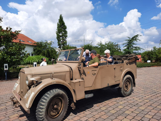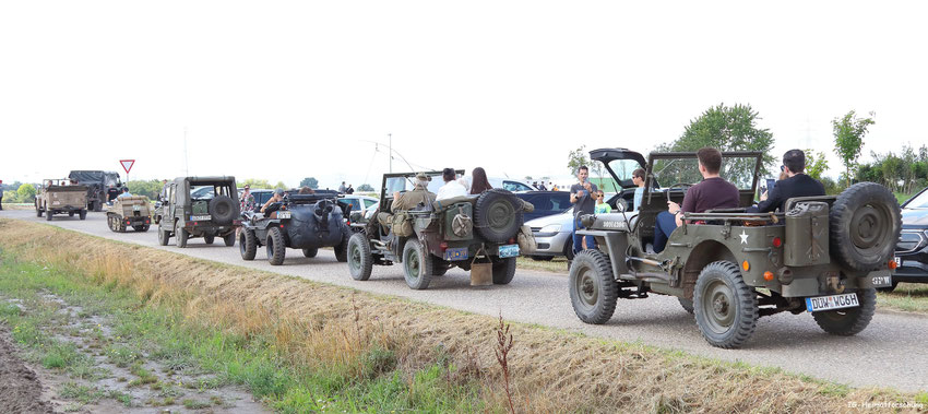 Nach vielen erstellten Gruppenfotos am Gedenkstein war es nun an der Zeit, auf Einladung des Bürgermeisters von Limburgerhof hin zum Golfclub zu fahren, wo wir durch die Gemeinde empfangen werden und eine Mahlzeit zu uns nehmen würden. Die Bundeswehr /Bundespolizei sperrte die Straße wieder ab und wir fuhren, teils mit Privatfahrzeugen, teils in der Kolonne mit Oldtimern, zum Golfclubrestaurant „La Maison“ in Limburgerhof. Die interessante Mischung aus Oldtimern fuhr direkt durch das Zentrum von Limburgerhof, wo einige Zuschauer nicht schlecht staunten. Fahrzeuge, die normalerweise nur im Museum zu sehen sind, fuhren nun in Kolonne an ihnen vorbei. Auch der 99-jährige ehemalige Flakhelfer, Herr Raubenheimer, hatte es sich nicht nehmen lassen und war in einen der amerikanischen Willys Jeeps geklettert. Bei bestem Wetter hatten auch die Nachfahren sehr viel Spaß daran, einmal in solch einem Fahrzeug mitzufahren.