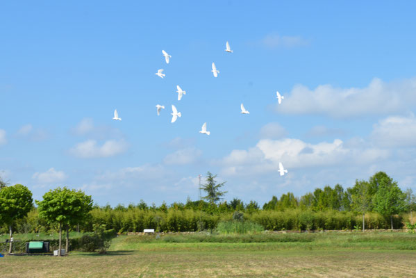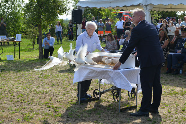 Im nächsten Schritt bat ich einen der Gäste, den 99-jährigen Herrn Werner Raubenheimer, nach vorne zu kommen. Herr Raubenheimer ist ehemaliger Flakhelfer aus der Flakstellung Ludwigshafen-Oggersheim, welche damals Teil des Flakgürtels um Ludwigshafen und Mannheim war. Er war damals als 15-Jähriger mit seiner gesamten Schulklasse in die Flakstellung beordert worden, wo sie weiterhin Schulunterricht bekamen, aber im Falle eines Fliegeralarms auch an den Geschützen, dem Kommandogerät, dem Radar etc. mithelfen mussten. Damals war er bei dem Überflug eines Bomberverbandes selbst auch verletzt worden, als ein alliierter Bomber nach Flakbeschuss in seine Stellung abstürzte. Nun wollte er hier an der Gedenkfeier der Besatzung eine letzte Ehre erweisen und auch zusammen mit mir für uns alle ein Zeichen setzen. Ein Zeichen des Friedens. Wir ließen daraufhin gemeinsam 12 weiße Tauben aufsteigen. Dies mit einem 99-jährigen ehemaligen Flakhelfer zu tun, war auch für mich ein besonderer Moment.