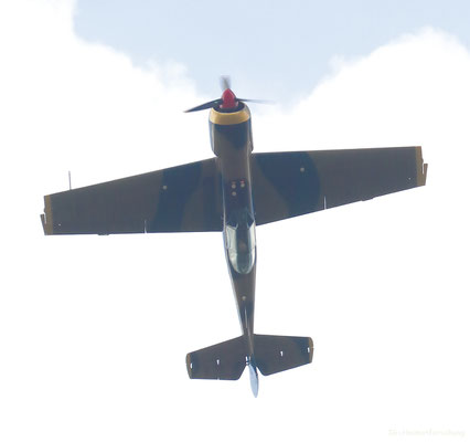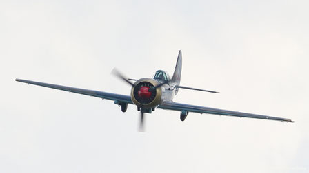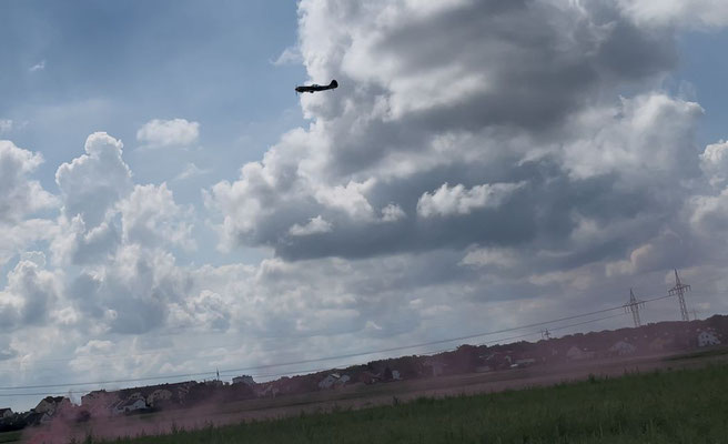 Als alle Anwesenden am Gedenkstein versammelt waren, zündete die Bundeswehr einige rote Rauchtöpfe und bei Dudelsackmusik, diesmal von Pipe Major Mackenzie, der ab hier von Piper Thomas Chelius übernommen hatte, überflog ein befreundeter Oldtimer/Warbird-Pilot mit seiner Maschine mehrmals den Veranstaltungsort. Ein letzter Fliegergruß und Ehrerweis an die Flugzeugbesatzung von Lancaster HK603. Die Propellermaschine, mit charakteristischem Sternmotor, versetzte uns optisch und akustisch zurück in die damalige Zeit. Ein besonderer Moment.