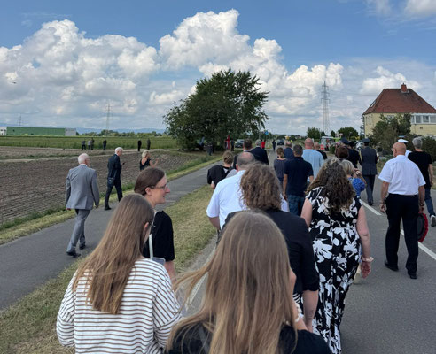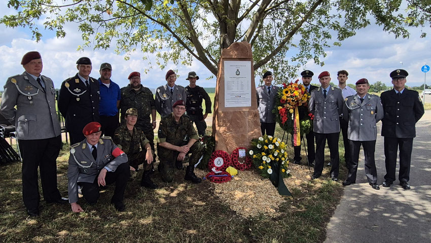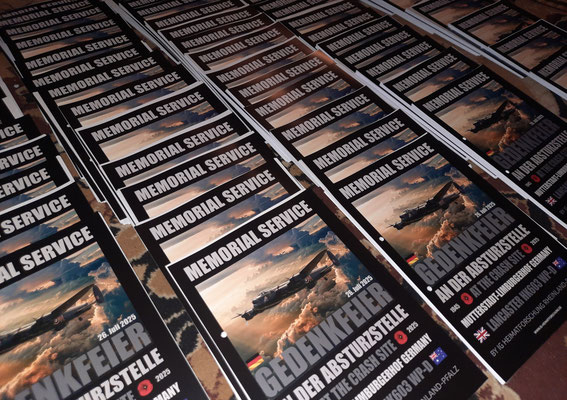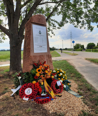 Die Absturzstelle von Lancaster HK603, damals, in 1945 geprägt durch einzelne Ackerflächen, ist heutzutage teils überbaut, umzäunt und liegt genau auf der Grenze zwischen den Gemeinden Mutterstadt und Limburgerhof. Deshalb hatte ich gleich zu Beginn des Vorhabens beide Bürgermeister kontaktiert. Mit Unterstützung des heutigen Grundstückeigentümers sollte der erste Teil der Gedenkfeier in der umzäunten Gartenanlage, hinter der heutigen Baumschule, stattfinden. Die Stelle, an der damals die Hauptteile des Flugzeugs heruntergekommen waren. Die Unterstützung des Eigentümers war über Jahre, schon ab Beginn der jahrelangen Bodenuntersuch-ungen, phänomenal. Das Projekt bzw. die Bodenarbeiten fand(en) über Jahre sozusagen größtenteils in seinem Garten statt. Der zweite Teil der Gedenkfeier würde außerhalb der Gartenanlage stattfinden. Einige Wochen vor der Veranstaltung war der Gedenkstein durch den Spender, die Fa. Steinmetz Fuchs & Sohn aus Limburgerhof, am Rande der Absturzstelle, außerhalb der privaten Gartenanlage, auf Gemeindegrund und direkt auf der Grenze der zwei Gemeinden, errichtet worden. Genau dort, wo in den umliegenden Äckern die überlebenden Fallschirmspringer gelandet waren. So war gewährleistet, dass der Stein, an der Mainzer Straße, besser sichtbar ist, weil dort jeden Tag sehr viel Verkehr daran vorbeifährt. Nach etlichen Ortsterminen, E-Mails, WhatsApp-Nachrichten und Telefonaten konnte der 26.07.2025 nun kommen.