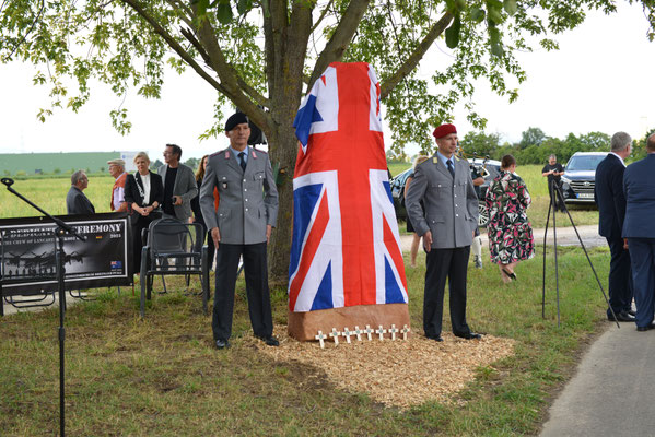 Am Tag der Veranstaltung ging es früh aus den Federn, und um 06:30 Uhr war ich an der Absturzstelle. Um 10:00 Uhr sollte es losgehen. Zuerst wurde die Gedenktafel an den bereits dafür vorbereiteten Bohrlöchern im Gedenkstein befestigt und, da es sich um ein britisches Flugzeug handelte, der Gedenkstein mit einer großen englischen Fahne abgedeckt. Außerdem wurden die Banner der beiden Gemeinden an den dafür vorgesehenen Stellen befestigt. Als ich damit fertig war, meldeten sich bereits die ersten Soldaten und Soldatinnen der Bundeswehrabordnung unter OFw/Oberfeldwebel Ralf Bordych, RAG Lagendarsteller Rhein-Erft, sowie zwei Bundespolizisten, die für die Sicherheit der Gäste, die Absperrungen, etc. sorgen würden. Nichts wurde dem Zufall überlassen. Das zuvor ausgearbeitete Sicherheitskonzept stand.