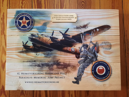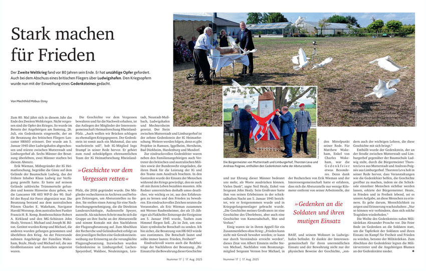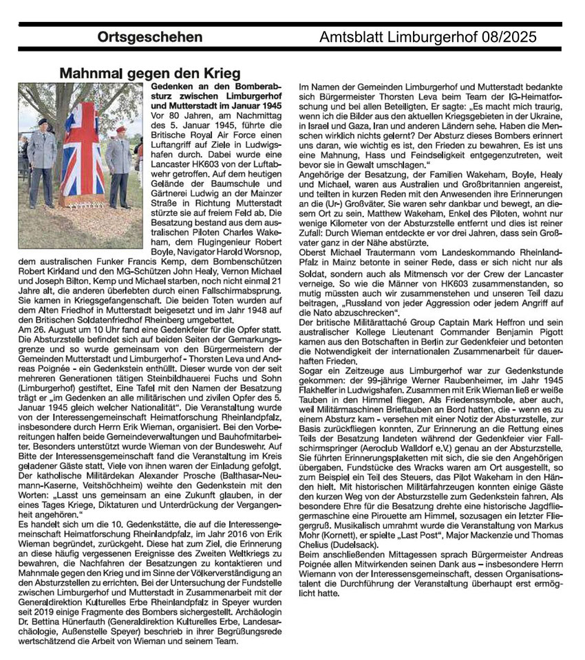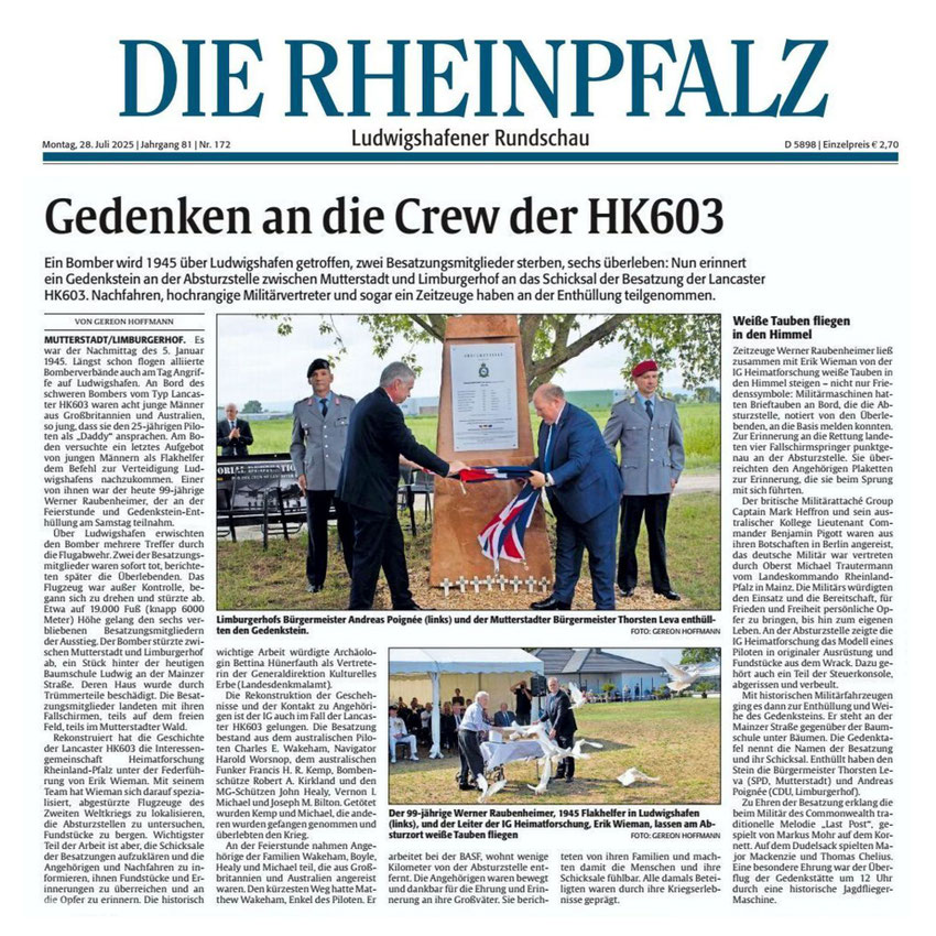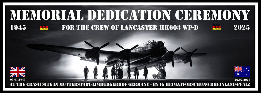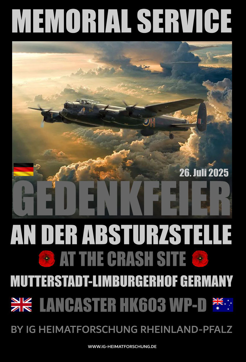 Am 26. Juli 2025 wurde in der Nähe von Ludwigshafen am Rhein, zwischen Mutterstadt und Limburgerhof, an der Absturzstelle eines britischen Bombers, durch die IG Heimatforschung Rheinland-Pfalz und in enger Zusammenarbeit mit den Gemeinden Mutterstadt und Limburgerhof, ein Gedenkstein enthüllt. Im 80. Jubiläumsjahr seit Kriegsende in 1945 wurde der Besatzung eines britischen Lancaster Bombers mit der Kennung HK603 WP-D, sowie allen Kriegstoten, gleich welcher Nationalität, gedacht. Es war die 10. Mahn- und Gedenkstätte in Folge, die in den letzten 10 Jahren durch die IG Heimatforschung realisiert wurde.