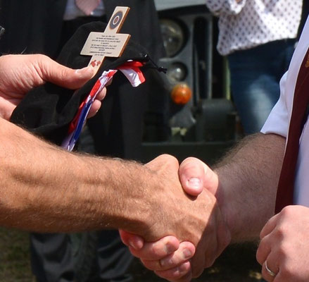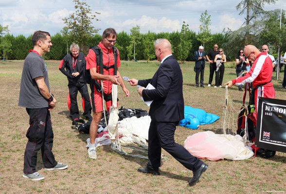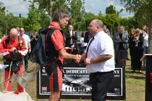 Nach dem Sprung übergab ich den Fallschirmspringern ein Parachute Memorial Jump Patch der IG Heimatforschung. Wie es zu diesem Gedenkprojekt kam, könnt ihr HIER lesen. Da ich selbst auch Fallschirmspringer bin, habe ich das Projekt in 2023, als mir die Idee kam, nachdem ich mit einem Nachfahren eines Absturzopfers gesprochen hatte, gestartet. Nach der erfolgreichen Landung überreichten die vier Fallschirmspringer das, was sie mitgebracht hatten: Alle Familien bekamen ein bedrucktes personifiziertes Erinnerungskreuz samt Widmung und jeweiliger (australischer oder britischer) Landesfahne. Für die Familien ein sichtlich emotionales Ereignis.