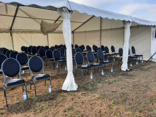 Als alle geladenen Gäste gegen 10:00 Uhr eingetroffen waren, spielte Thomas Chelius, einer der Dudelsackspieler, während des Sektempfangs, ein Willkommenslied auf dem Dudelsack. Anschließend nahmen die Gäste ihre Plätze im Zelt ein, über ihnen hängend ein originaler Fallschirm aus 1943. Ein identisches Exemplar, mit dem die überlebenden Fallschirmspringer damals hier abgesprungen waren.