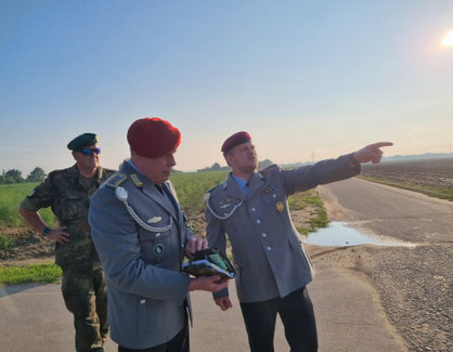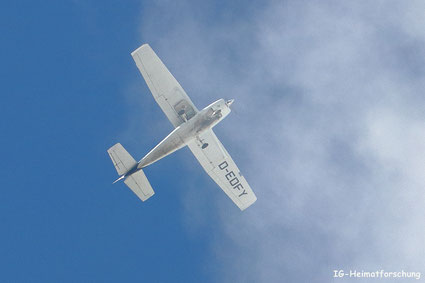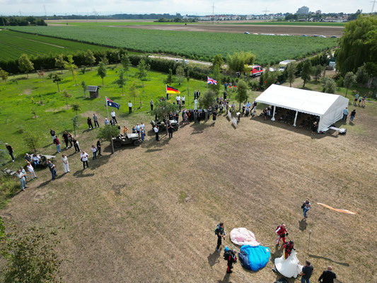Währenddessen hatte ich die Info bekommen, dass der geplante Fallschirmabsprung kurz bevor stand. Das Flugzeug war gerade aufgestiegen. Da sich damals bei dem Absturz von Lancaster HK603 in 1945 sechs Insassen mit dem Fallschirm retten konnten, würden nun, genau 80 Jahre nachdem sich über Mutterstadt/Limburgerhof Fallschirmspringer in der Luft über dieser Absturzstelle befunden haben, wieder Fallschirmspringer abspringen, in Erinnerung an das, was hier damals geschehen ist. Da Sport-Fallschirmspringer meist nur an Flugplätzen abspringen, war diese sogenannte „Außenlandung“ auch für sie wieder etwas Besonderes. Zumal dieser Sprung auch noch auf historischem Boden mit einem speziellen Zweck stattfand. Dieser Sprung war, wie im vergangenen Jahr bei der Gedenkfeier in Mechtersheim auch, im Vorfeld durch die zuständigen Behörden (Ordnungsamt, Naturschutzbehörde, Grundstückseigentümer, etc.) schriftlich genehmigt worden. Die vier Fallschirmspringer würden den Familien/Nachfahren nach dem Sprung auch noch ein Souvenir überreichen: Ein speziell bedrucktes Erinnerungskreuz samt Landesfahne.