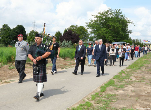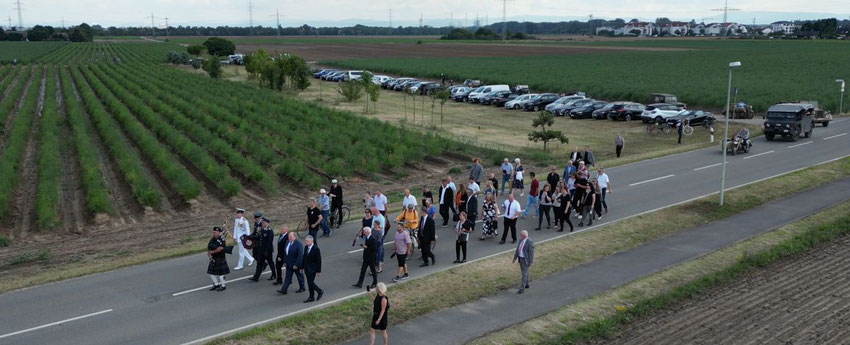 Anschließend bat ich alle anwesenden Gäste mir zu folgen. Es war nun an der Zeit, das Monument zu enthüllen. Unter den Tönen des Dudelsacks liefen alle Anwesenden hinter dem Dudelsackspieler, gefolgt von einigen Gästen in historischen Fahrzeugen, zu dem auf der anderen Straßenseite gelegenen mit der englischen Fahne abgedeckten Gedenkstein, den die Bundeswehr die ganze Zeit über „bewacht“ hatte. Die Mainzer Straße war durch die Bundespolizei und die Bundeswehr weiträumig abgesperrt worden und alle Anwesenden liefen über die, normalerweise vielbefahrene (der Verkehr war vorübergehend angehalten worden), Mainzer Straße in Richtung Monument. Dort angekommen folgte das nächste Highlight.
