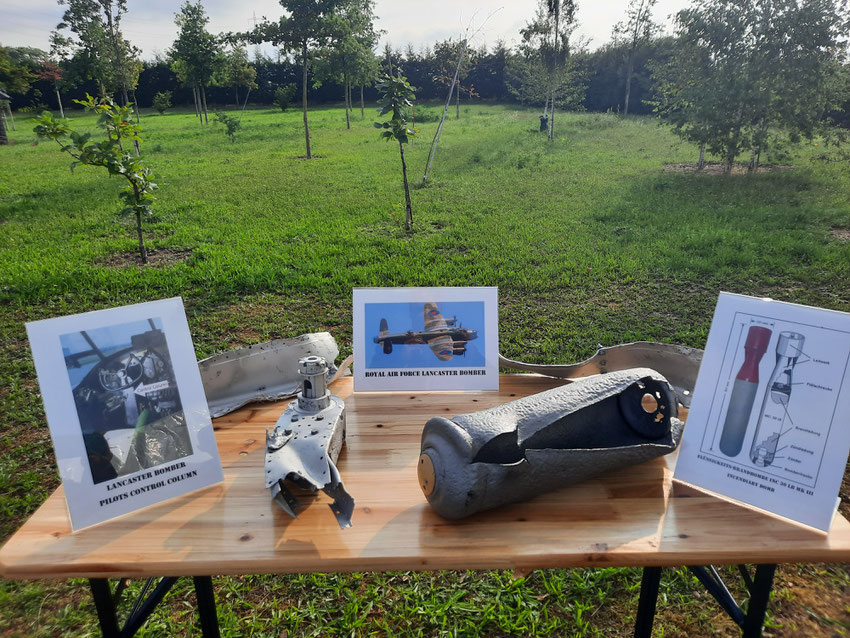 Viele Gäste nahmen sich anschließend Zeit, um einige Fundstücke und ein original eingekleidetes Modell eines RAF-Besatzungsmitgliedes anzuschauen. Man konnte z.B. Rumpfteile des dort abgestürzten Lancaster Bombers, ein Foto eines Lancaster Bombers, eine leere Phosphorbombe und ein großes Fragment der Lenksäule des Piloten Charles Wakeham, die er kurz vor dem Absturz noch in seinen Händen gehalten haben muss, bestaunen. Dies war vor allem für den Neffen des Piloten Wakeham, Dr. Matthew Wakeham, historisch und emotional äußerst bewegend.