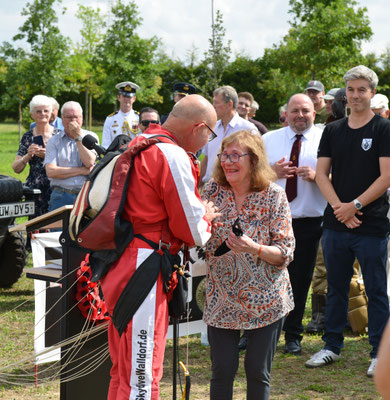 Schließlich entstand die Idee bzw. das Vorhaben, zusätzlich zu den bereits permanenten Gedenksteinen, die wir jedes Jahr an von uns lokalisierten/untersuchten Absturzzellen enthüllen (WK II Memorial Projekt), generell in Gedenken an jede abgestürzte Flugzeugbesatzung, diesen (letzten) Sprung, den viele damals nicht mehr machen konnten, bevor sie verstarben, zu machen. Vor dem Hintergrund, diese Männer, ihre Namen, ihr Schicksal, ihre Geschichte, symbolisch am Leben zu erhalten. Direkt nach dem Absprung und der Landung wird hierfür ein in der Luft mitgeführtes Poppy-Memorial-Kreuz, das einer bestimmten Besatzung gewidmet wird, auf der Landezone platziert. An der Stelle verbleiben dann auch diese kleine Kreuze, in mitten der Landezone, als kleines Mahnmal.